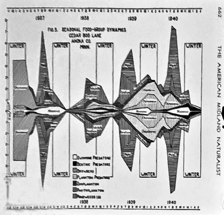 Above is a graphical representation of the seasonal food group dynamics of Cedar Bog Lake by Cedar Creek's foundational ecologist (more specifically, limnologist) Ray Lindeman. Ray was working on a quantitative analysis of total energy consumed and released in a closed system (in this case, a kettle lake). He wanted to understand and possibly visualize the dynamic interconnectedness of all biotic and abiotic forms within it. In the following quote, all underlines are mine.