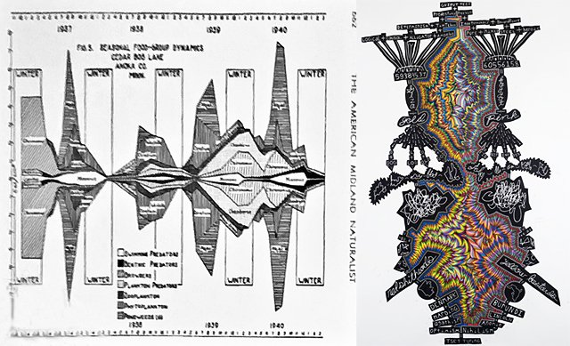 Ray Lindeman's data graphic on the left is suggestive of my friend John O'Connor's artwork, an example of which is on the right. John creates absurdly fantastic graphs that bridge the manic accumulation of sensory, linguistic, and numerical data with the pandemonium of an elucidating mind. The goal isn't to represent data, but to exhume our immersion within it; not to create order from external choas, but to externalize the chaotic. Lindeman, in search of an encapsulation of a biodynamic system, developed graphics that tend to create order, more than reveal it, out of the need to read an inundation of quantitative data, to find connections and possibly draw conclusions. In the practice of science, data graphics are meant to be read, but art is intended to be experienced.