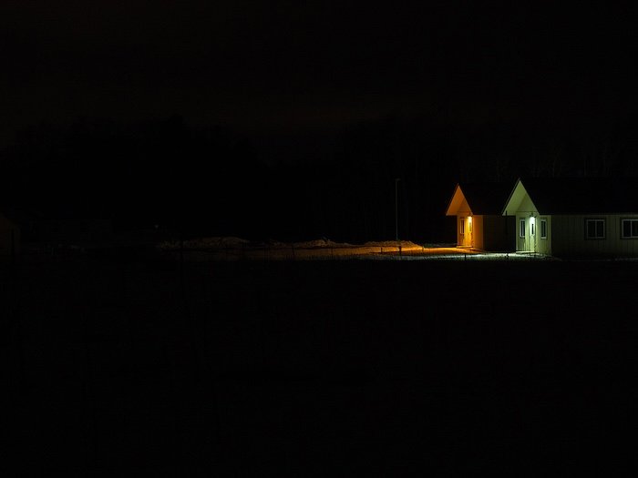 Waking for the first time in a structure designed by architecture students for the 2009 Solar Decathalon, in an old field turned prairie, in a place nine square miles in size, snow falling lightly, it is the sun, a faint and hazy circle barely visible above the oak trees, that allows any orientation. The kitchen window, I now see, faces directly east on this vernal equinox and the long wall of windows, faces to the south, as does the solar roofline of this Cedar Creek home