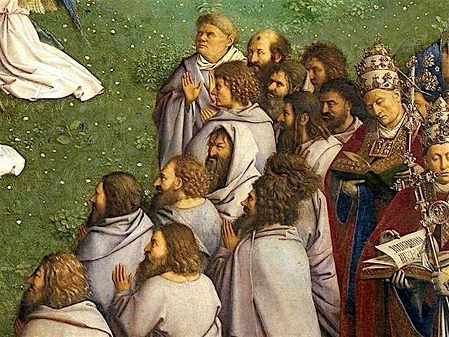 Jan van Eyck, 1432, detail of his Ghent Alterpiece. The compression created by longer focal length camera lenses mirrors the symbolic compression of space in painting. The squinting and devotional gazing resonates with the expressions of children in attention to oak leaves.