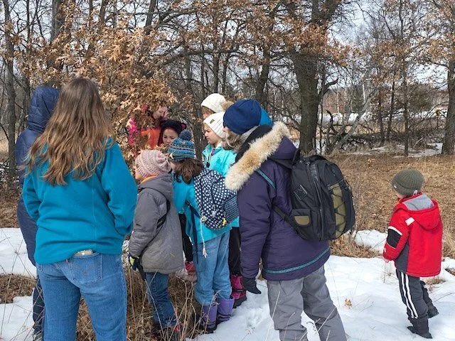 In what resembles a partial scene from early Netherlandish painting, kids and adults are pointed toward oak leaves and given the language to identify the trait of clinginess found in some deciduous species -marcescence. This connection to the painting of Northern Europe in the 15th and 16th centuries may not be as superficial as it appears. The refinement of the lens, its use in art and science, the growing secularism of images in response to the iconoclasm of the Reformation era, and the growth of landscape as a genre of art have influenced an image like this.