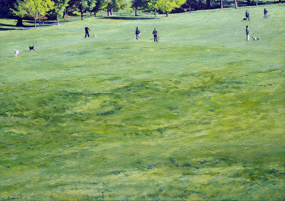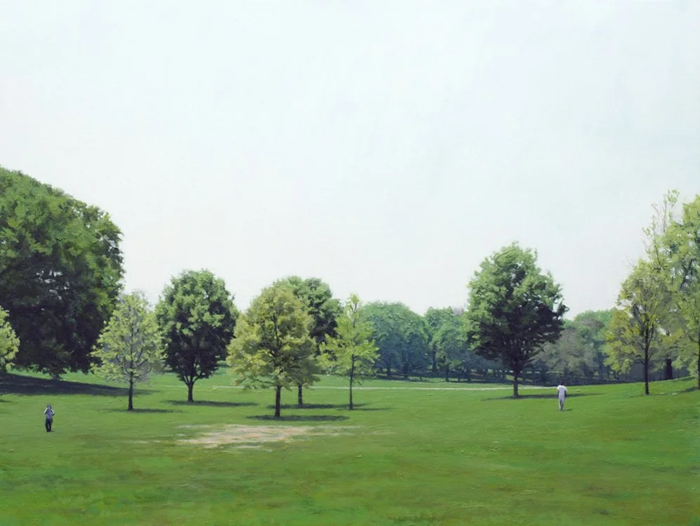 The paintings become an intimate psychological chamber, whose spatial emptiness can be filled by the viewer’s own relationship to public landscape. These park spaces are not merely seen, they are felt. Yet they don’t tell you what to feel, they make you aware that you are feeling.